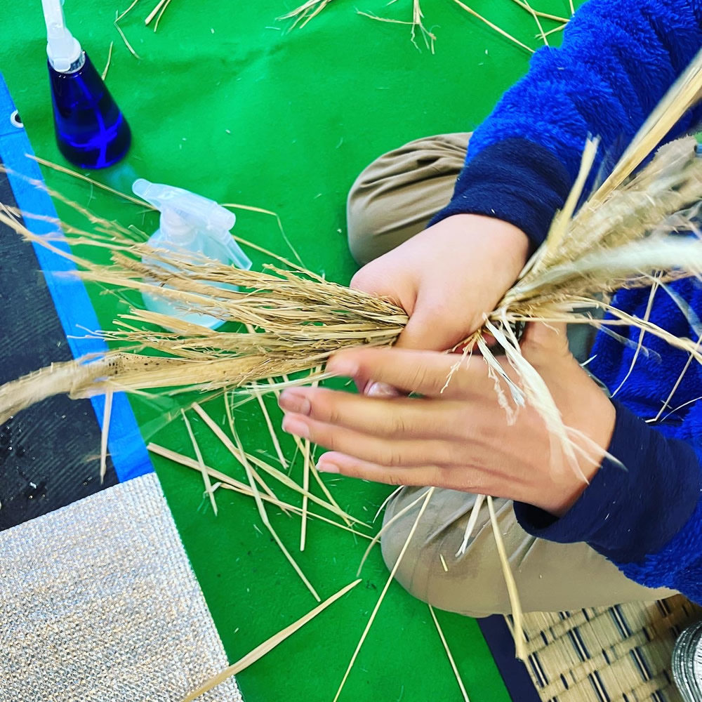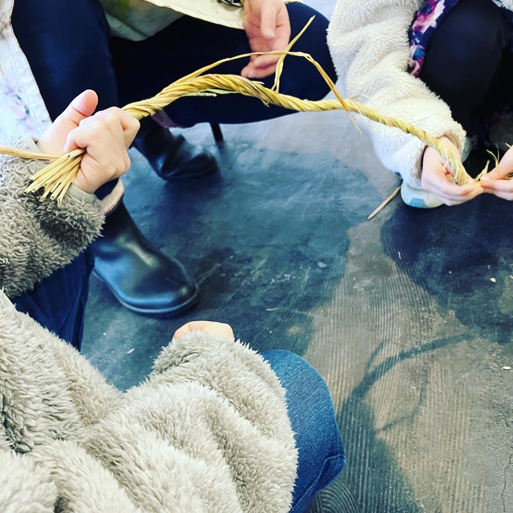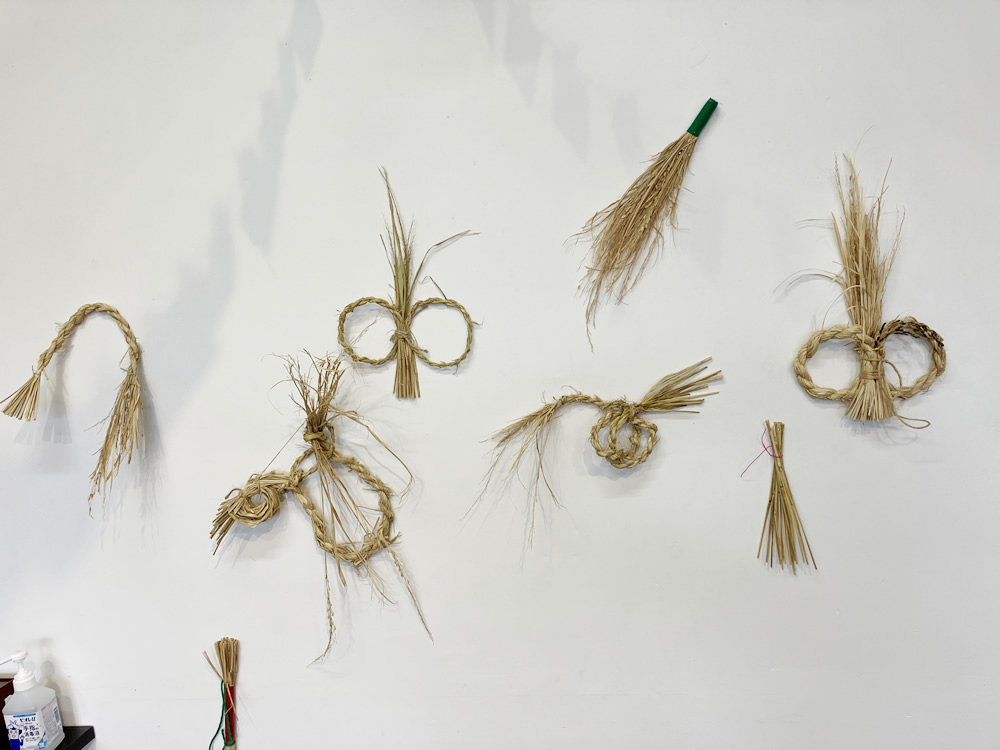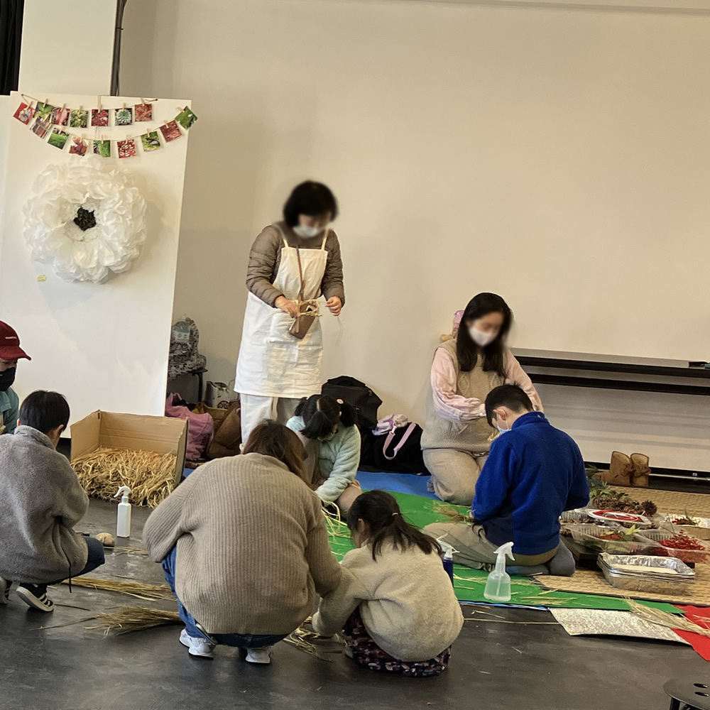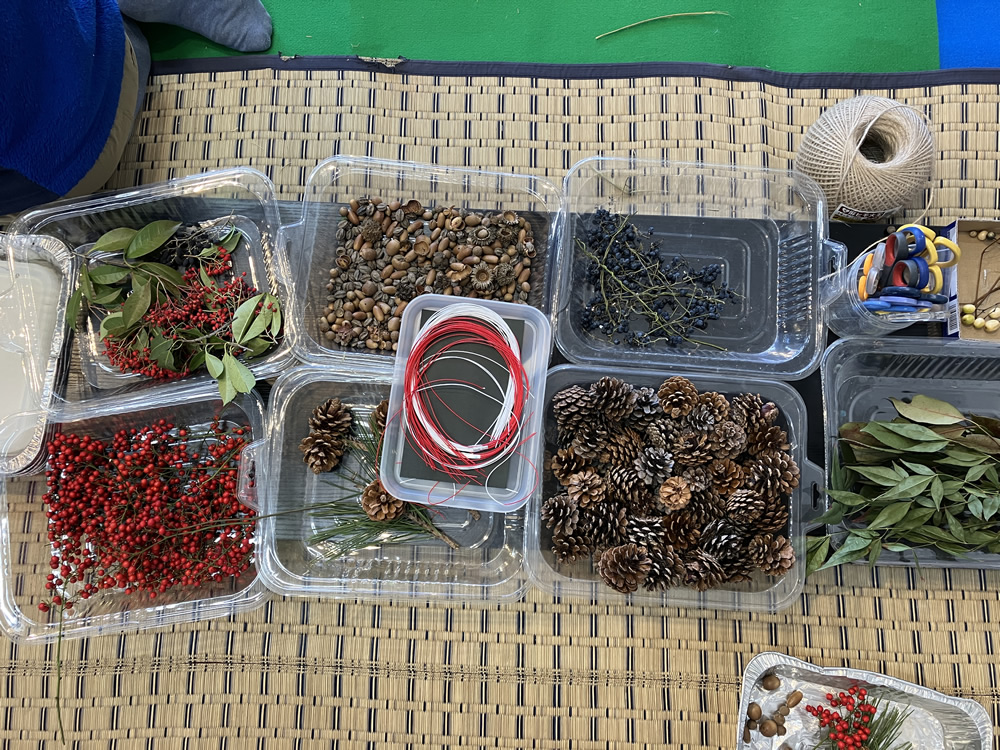 クリスマスからお正月まで飾れるリースや飾りを作りませんか?わらを編んでリースを作ったら、松ぼっくりや南天の実、こよりで作った飾りをグルーガンで張り付けて完成!